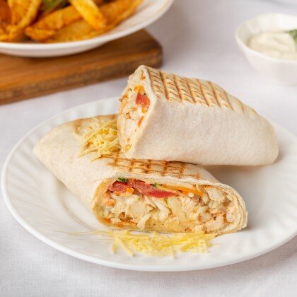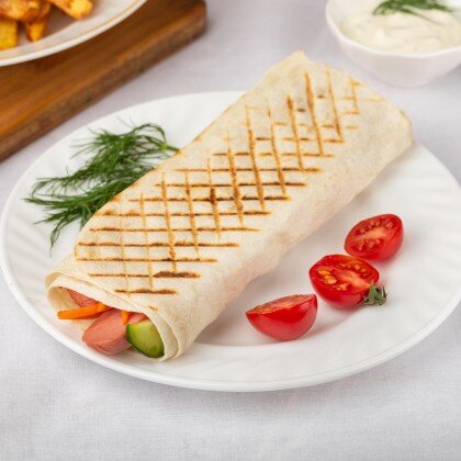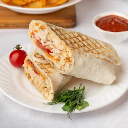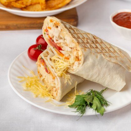Куриная грудка, капуста, морковь по-корейски, огурцы свежие, помидоры, соус чесночно-майонезный