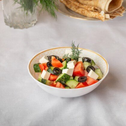 Лёгкий и полезный перекус. Попробуйте наш овощной салат из свежих огурцов, помидоров, болгарского перца и репчатого лука, украшенный ароматной зеленью. Этот аппетитный салат станет отличным дополнением к вашему обеду или ужину